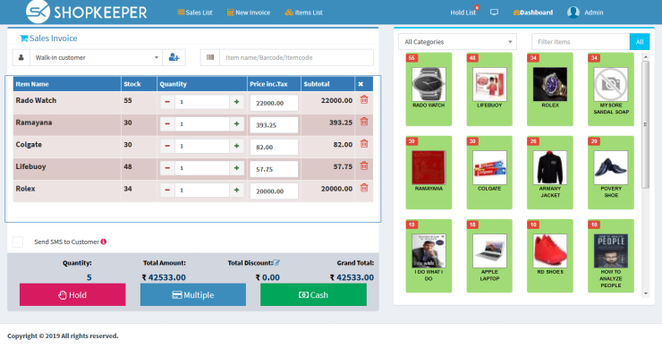 Application manages the Sales & Sales Return Invoices as well as Payments, Purchase & Purchase Return Invoices as well as Payments, Customers information(Customers Bulk Import), Suppliers information(Suppliers Bulk Import), Expense information, Tax & Tax Grouping, Units, Categories, Items(Items Bulk Import), Brands and business required Reports and much more.